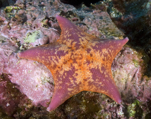 5 short, broad arms, (but occasionally 4 or 6, or more rarely 7) with a depression between each arm. Aboral and oral surfaces with scale-like roughening. Blue, green, brown, red or mottled variations aborally. Oral surface pale. To 25 cm (10 in) across.