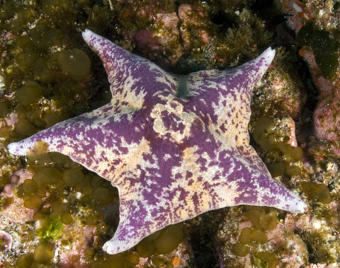 In favourable shallow habitats this colourful sea star can be very abundant, almost carpeting the bottom in a patchwork of green, red, blue and mottled colours. It is especially prolific in shallow bays on the west coast of Vancouver Island, on the central and north coast of British Columbia and in Haida Gwaii (Queen Charlotte Islands). It is rarely found in the Strait of Georgia. It eats seaweeds, sponges, bryozoans, sea urchins and squid eggs and also scavenges dead animals. It has a very large cardiac stomach but is not able to open bivalves. This star is often host to the slender, dark brown BAT STAR COMMENSAL WORM Ophiodromus pugettensis on its oral surface.