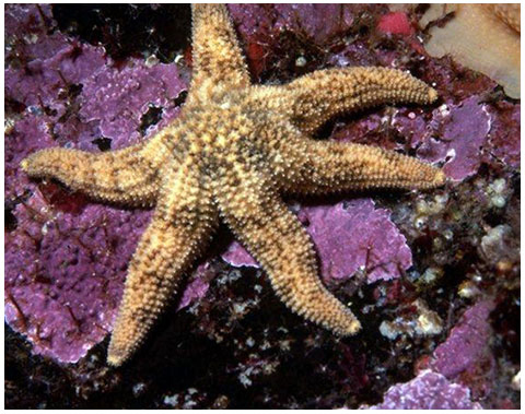 The PURPLE STAR is a "typical" 5-armed star demonstrating the radial symmetry characteristic of echinoderms.