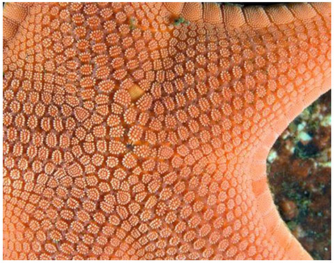 With the aid of a magnifying glass, many minute but exquisite details can be seen on the skin of sea stars. Many species have tiny calcareous pincers called pedicellariae, usually situated in clusters or in wreaths surrounding spines. Variously shaped, pedicellariae may look like forceps, bird beaks, or even bivalve clams. These mini-pincers are extremely effective at deterring predators and keeping the surface free of parasites and fouling organisms. Also scattered over the surface are clusters of tiny finger-like protrusions of the body wall. These thin-walled gills protrude between the skeletal plates, serving to exchange respiratory gases and excrete liquid wastes.