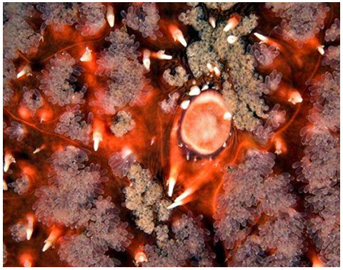 Streams of tiny eggs pour from the gonopores located in this female PAINTED STAR'S armpits. The eggs are fertilized by male sperm and develop into free-swimming larvae that eventually settle to the bottom.