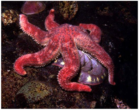 A COLOURFUL SIX-ARMED STAR tackles a chiton at Race Rocks, BC.
