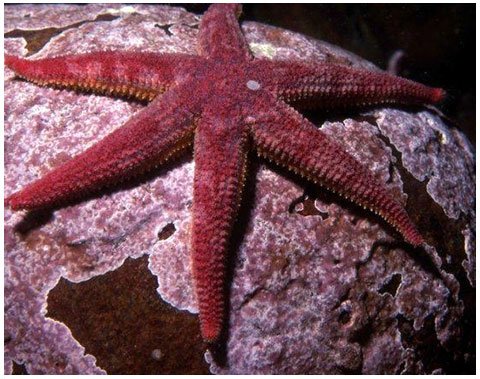6 tapering arms. Aboral surface quite rough. Often pinkish with mottling. To 10 cm (4 in) across.