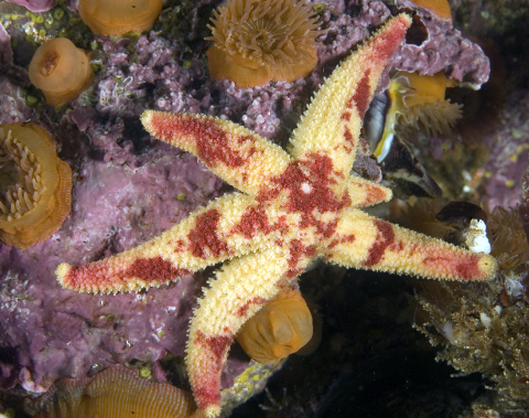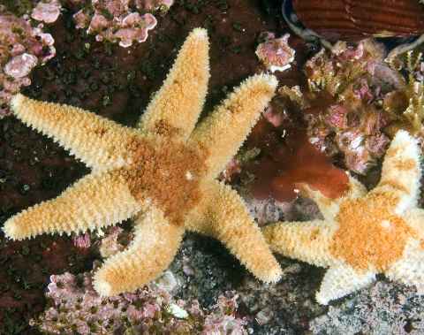 A pair of COLOURFUL SIX-ARMED STARS in the shallows of an exposed pinnacle reef in outer Barkley Sound on the west coast of Vancouver Island.