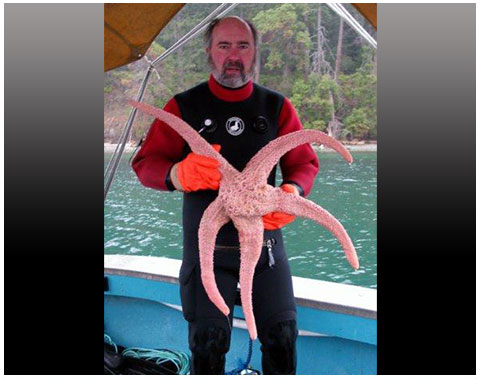 This monster was found (and released unharmed) in Port Moody Arm near Vancouver by Rod MacVicar. It measured 99 cm (3.2ft) across, the largest pink star recorded to date. Photo courtesy Ruth Foster, Pacific Wildlife foundation.
