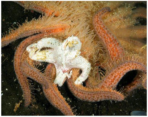 This GIANT PINK STAR was captured by a SUNFLOWER STAR, which occasionally eats other stars.