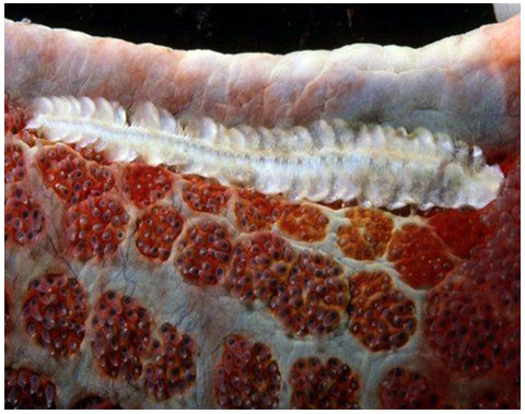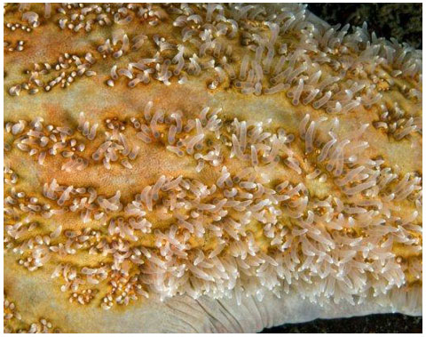 A close-up view of the aboral surface showing the numerous, rather long gills. The gills can be totally withdrawn into the body wall.