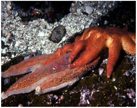 This LEATHER STAR has been attacked and is being eaten by a MORNING SUN STAR in Jervis Inlet, BC.