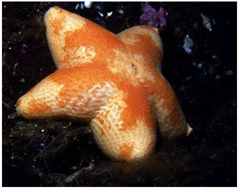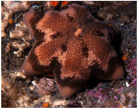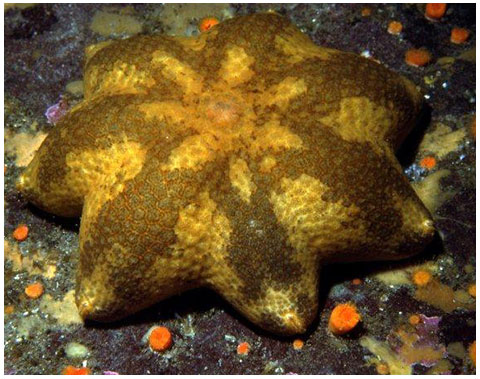 5 (rarely 6 or even 7) short, puffy arms with a broad disc bearing a central pore. Ends of the arms often upturned. Orange, yellow, brown or grey. Many have a darker star-shaped pattern overlying the base colour. To 24 cm (9.4 in) across. Recent genetic research by Christopher Wells at the University of Washington has suggested that the specimens with the radiating dark patterns are a separate, undescribed species.
