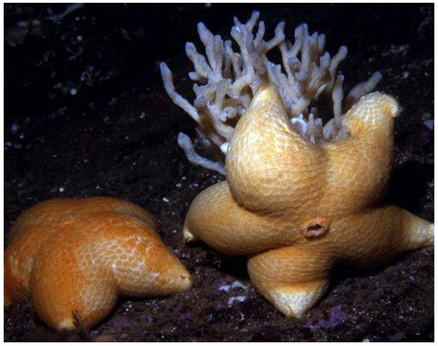 A typical SLIME STAR. Note the stubby arms with upturned tips and the opening, called the osculum, in the centre.