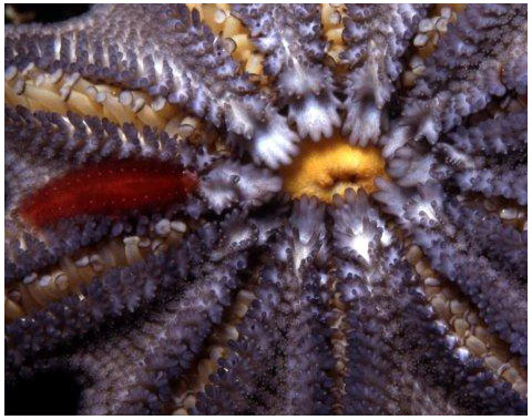 A close-up view of the oral side. Note the large, blunt mouth spines and the blue pigment on the spines alongside the tube-foot groove. Just to the left of the mouth is a RED COMMENSAL SCALEWORM Arctonoe pulchra.