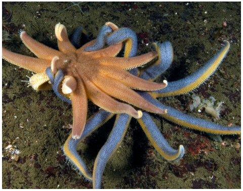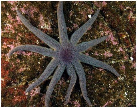 10 long, tapering arms (occasionally 11). Orange, yellow or reddish aboral surface, contrasted by a distinct blue stripe down the length of each arm meeting on the oral disc. Blue pigmentation along each side of the tube-foot groove. To 58 cm (23 in) across (a very large specimen from Howe Sound, BC).