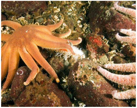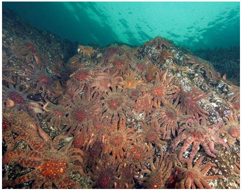 Prior to the autumn of 2013 (when Sea Star Wasting Disease appeared) the SUNFLOWER STAR was sometimes found in very dense aggregations in Howe Sound, BC, during the winter. In this image there are approximately 12 stars per square metre. They congregated to eat barnacles and mussels but also appeared to become less active at this time.