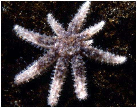 Newly settled SUNFLOWER STARS have 5 arms. Soon a sixth arm sprouts and subsequent new arms sprout in pairs on either side of the sixth arm.