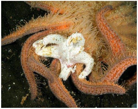 The cast off arm can been seen in the grasp of the MORNING SUN STAR. It gets a meal; the SUNFLOWER STAR escapes with its life.