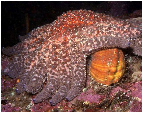 When a NORTHERN ABALONE is attacked it responds by twisting its shell side-to-side and rapidly gliding away from the attacker. If it doesn't respond quickly enough and the star gets a good grip with its tube-feet, it's game over.