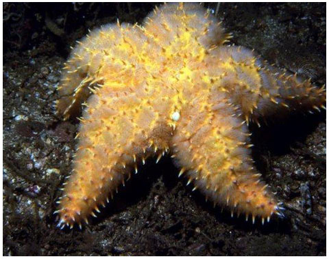 5 fat arms. Aboral surface mesh-like with many white, sharp spines. Cream to bright orange. To 20 cm (8 in) across.