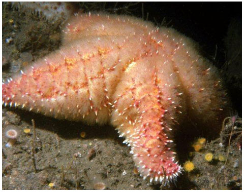Uncommon. I’ve seen only a few of these puffy, very spiny stars, all on the west coast of Vancouver Island. The wicked spines are seriously sharp: be careful when handling one if you wear dry gloves. One area where there have been a few sightings is the seaward end of Alberni Inlet in Barkley Sound on the west coast of Vancouver Island. Here at dive sites such as Mutine Point and Tyler Rock one might encounter a THORNY STAR.